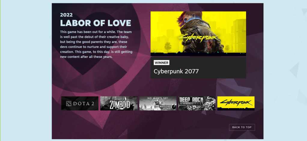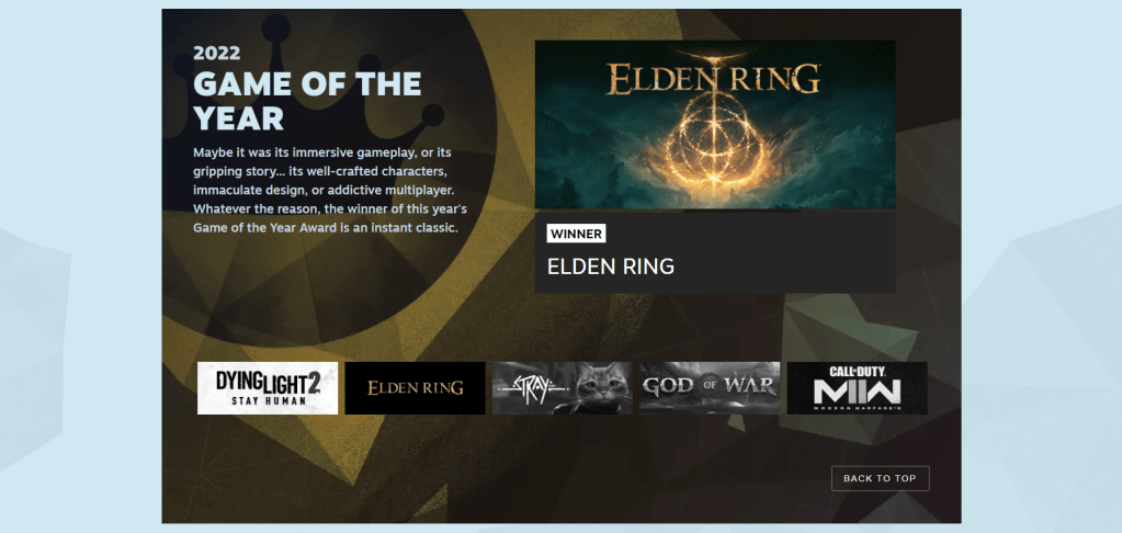 Happy New Year everyone! It’s a new year and that means new things to discuss. In my case, that means playing catch-up since I can never stay on topic. However, I have something relatively recent to talk about this time and that is the Steam Awards 2022, awards that are honestly more worthwhile than anything present at the Oscars. I have a picture detailing this below.