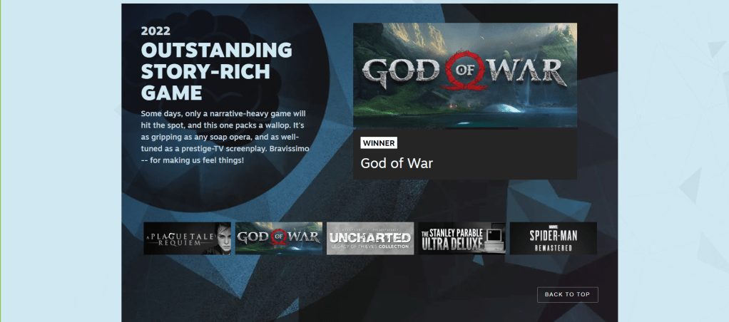 Yeah. I never thought I would say that the God of War series would be doing the best in the story department, but here we are. I will say it is definitely deserved, but honestly, I think almost everyone in this category was a strong competitor. Almost.