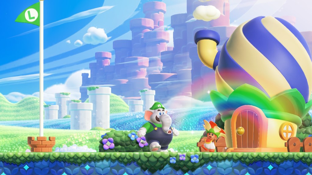 Speaking of powerups, there aren’t a ton of powerups in this game. There are only five standard powerups. The three that are new are the Bubble Flower, Elephant Fruit, and Drill Mushroom. The Bubble Flower is useful for both attacking and platforming, the Elephant Fruit is great for squaring up with enemies, and the Drill Mushroom is great for doing some upside-down platforming. The big powerup though is the Wonder Flower which is a powerup with a unique effect in every stage you find it on. There are three things that can potentially happen when you encounter them. Either the stage will undergo a transformation, your character will undergo a transformation, or both will happen at once. It is an interesting way to make each level feel unique. I certainly haven’t gotten tired of playing it. In fact, I almost forgot to write this post because I lost track of time. What can I say? I’m having a good time. Sue me. Anyway, the game is a trip and I’m along for the ride.